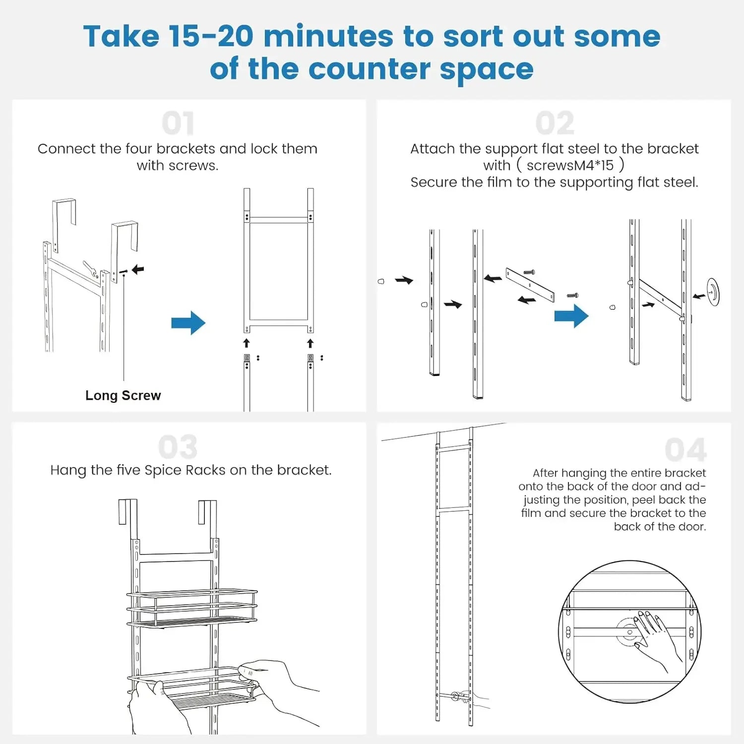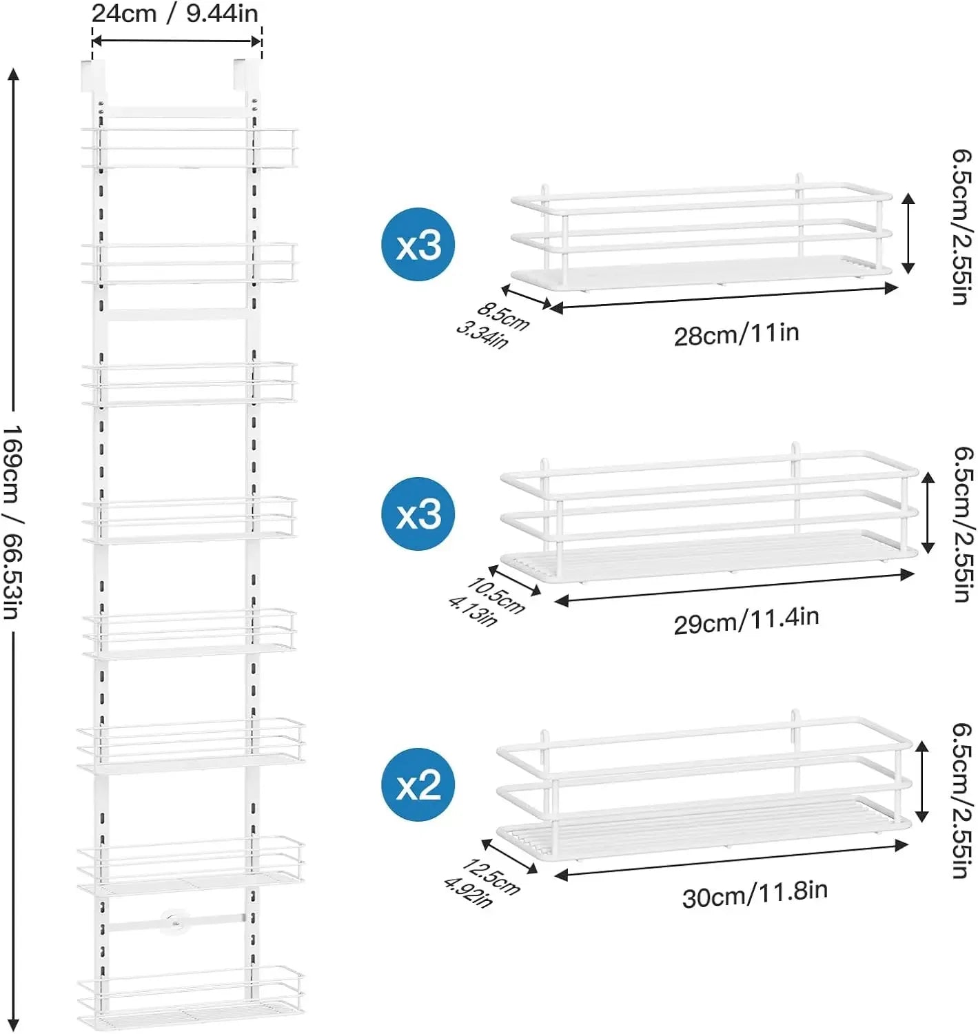 - Large capacity: 3 large shelves (11.80\"L x 4.92\"W x 2.55\"H), 3 medium (11.40\"L x 4.13\"W x 2.55\"H), and 3 small (11.00\"L x 3.34\"W x 2.55\"H) to categorize spices, cans, snacks, and sundries.