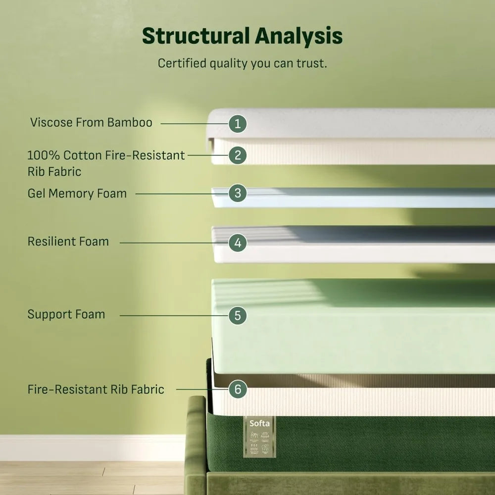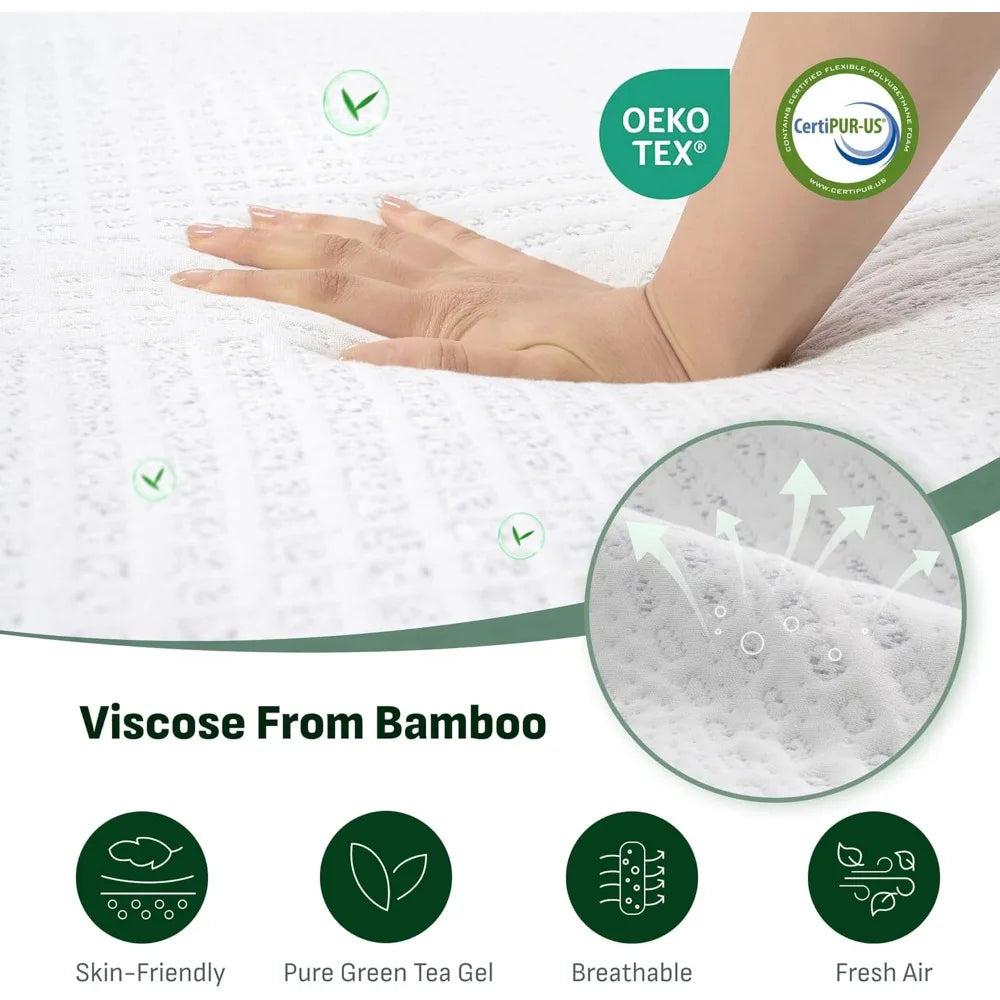 - Gel-infused memory foam mattress with cooling technology and viscose-from-bamboo cover keeps you cool, cushions pressure points, wicks moisture, and is infused with green tea extract to promote all-night freshness.