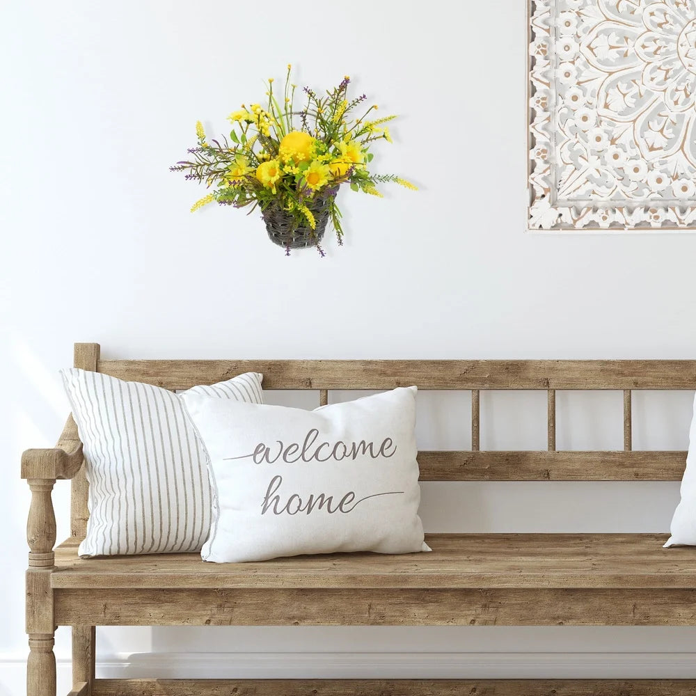 Brighten your space with a vibrant XMSJ artificial floral hanging basket that blends lemons, yellow daisies, and purple accents for year-round charm.