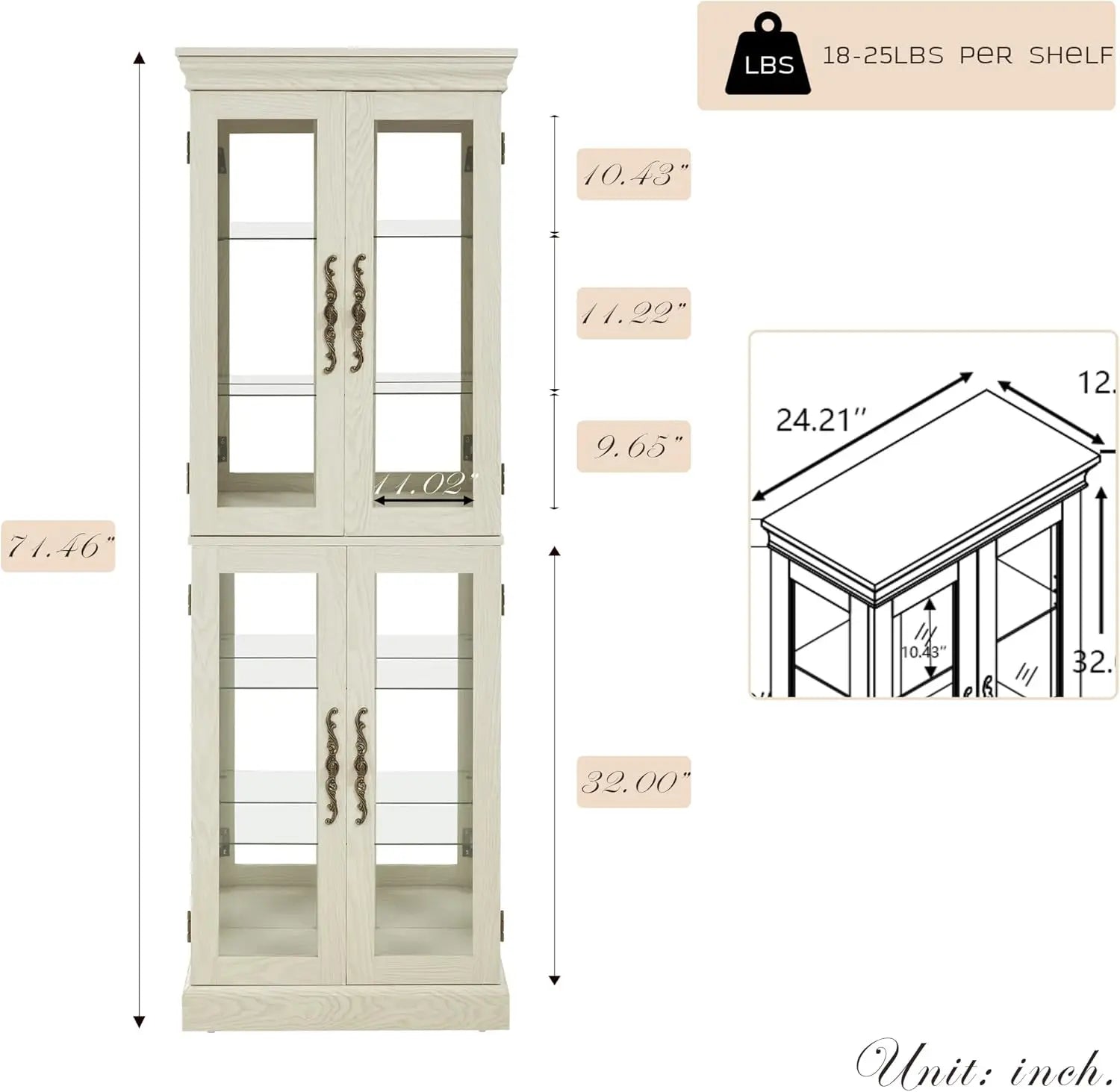 - White wooden styling with tempered glass doors blends classic charm with modern durability, creating an elegant display for any living room or dining space.