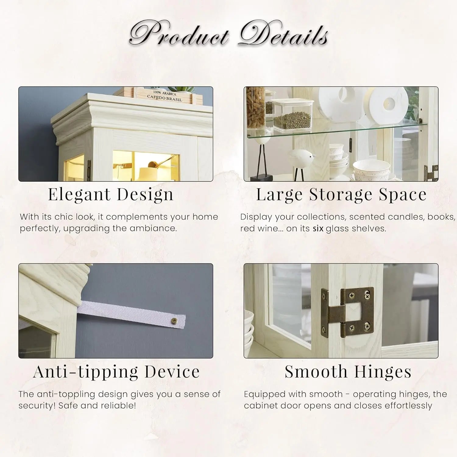 - Six adjustable shelves let you tailor the display for bottles, collectibles, keepsakes, or seasonal decor, giving you flexible arrangement options.