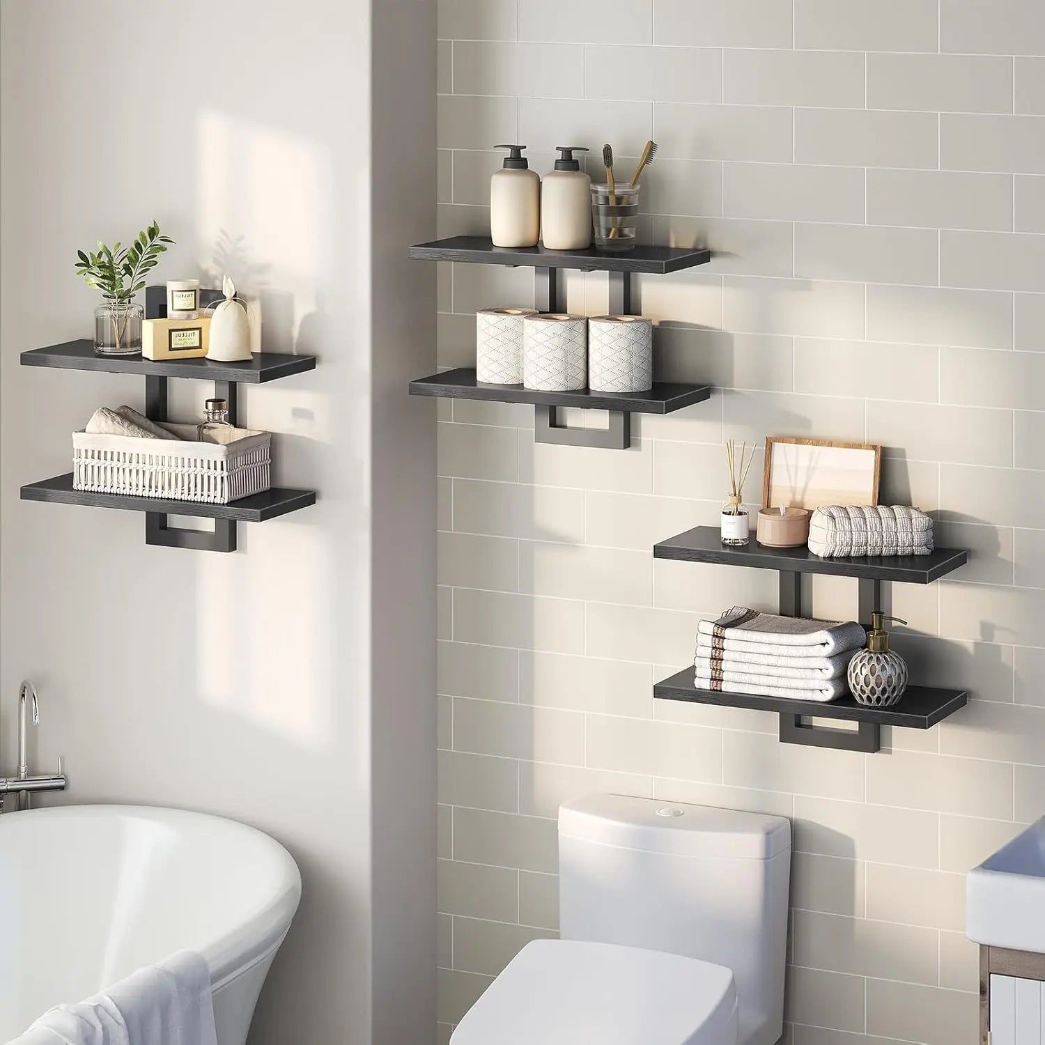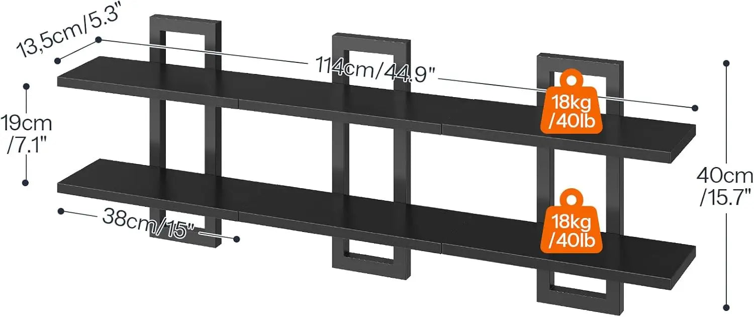 - Three 2-tier, 15-inch floating shelves in a bold black finish deliver versatile storage for living rooms, bedrooms, kitchens, and bathrooms.