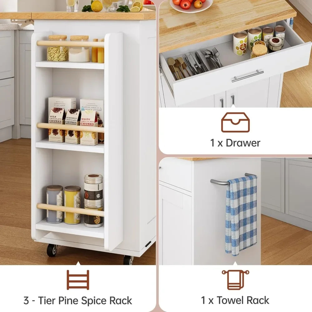 Mobile Kitchen Island On Wheels With Trash Can Spice Rack