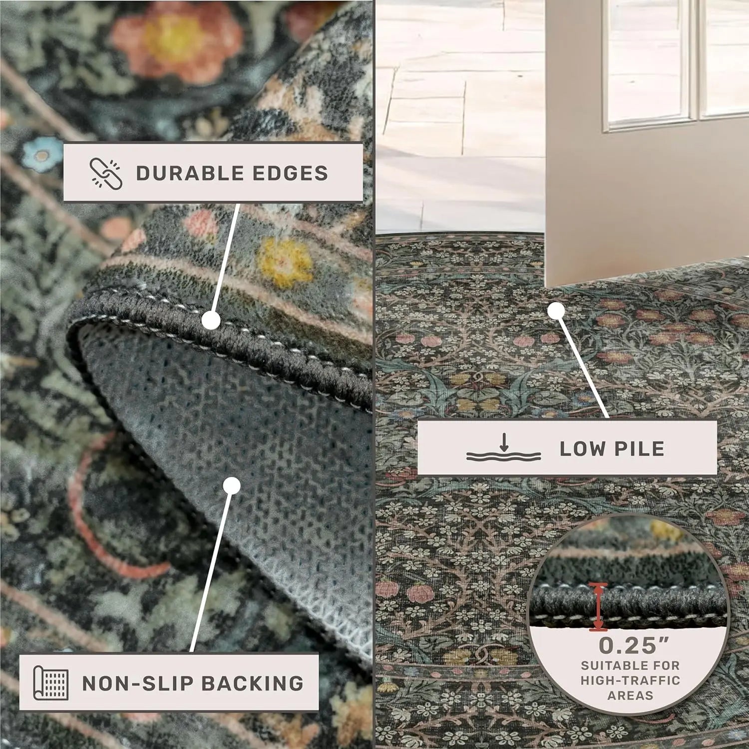- Non-slip grip keeps the rug steady on smooth floors, so you move confidently through high-traffic areas and around furniture.